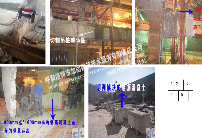 1、液壓鉗;2、3、4、5采用金剛石繩鋸切割大梁。